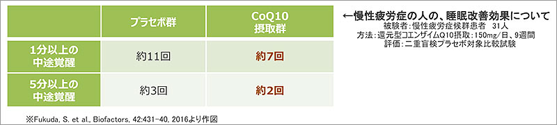 そんな慢性疲労症候群の患者に対し、還元型コエンザイムQ10 を定量摂取させたところ、途中で目が覚める回数が減少。睡眠の質が改善したという試験データがある。