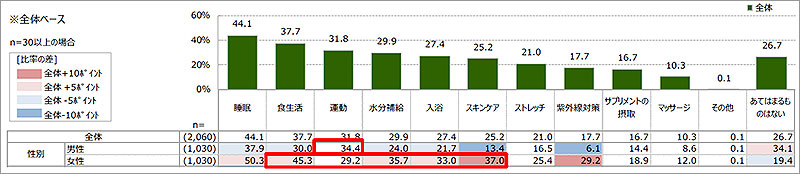 男女別でみると、1位は変わらないものの、男性では2位が「運動」であったのに対し、女性では2位が「食生活」、3位が「スキンケア」、4位が「水分補給」、5位が「入浴」となり、「運動」は6位とかなり下になった。