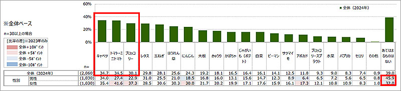 男性では約半数の人が「あてはまるものはない」(45.9%)と回答しているのに対し、女性は約3割に留まり、女性の方が美容への野菜摂取意識が高いことがわかる。