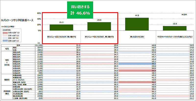 パッケージサラダを1年以内に利用した人を対象に、「千切りキャベツ」のパッケージサラダ購入時の使用タイミングについてたずねたところ、「買い置きする」と答えた人(46.6%)が、「買った日のうちに使う」(44.8%)を上回った。
