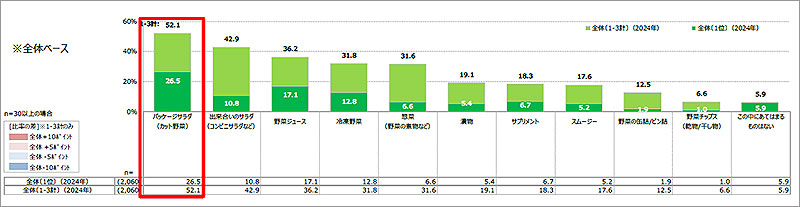 2015年から同様の意識調査をするなかで、「野菜ジュース」が長年継続的に1位だったのが、2022年に初めて「パッケージサラダ」が抜き、今年で3年連続1位に。
