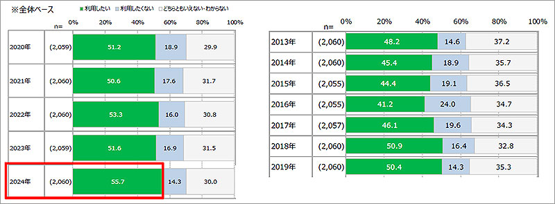パッケージサラダの利用意向についてたずねたところ、55.7%と過半数の人が利用したいと答え、同じ設問を開始した2013年以降最も高い結果に。