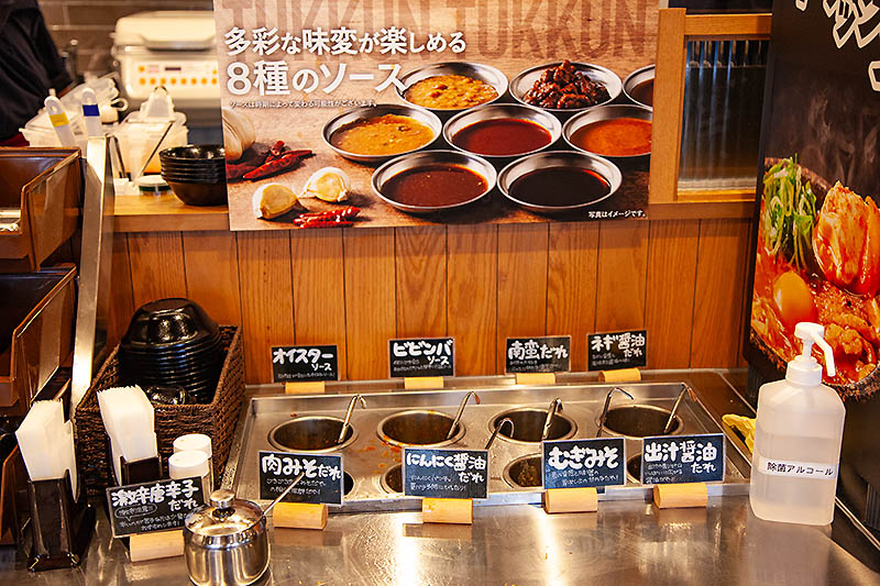 それでは物足りない、という方やより自分好みの味わいに仕上げたい方には「ソースバー」の活用をおすすめしたい。実はこの店、多彩な味覚が楽しめる「8種類のソースバー」が設置されている。