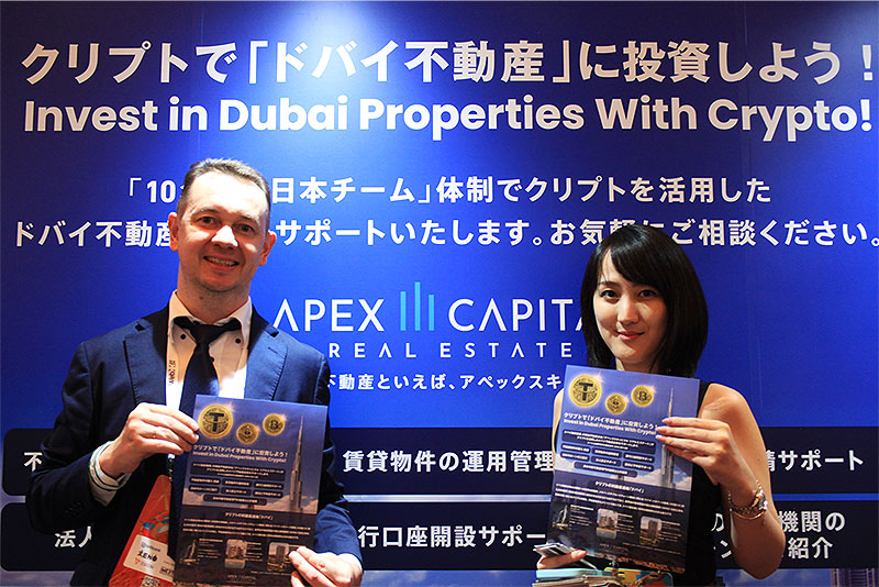 日本人スタッフを現地に配置し、ドバイの不動産売買や不動産管理サービスを手がける Apex Capital Real Estate が、「WebX2024」(8/28-29 @ザ・プリンスパークタワー東京)でアピールしたのは、冒頭のとおり「ビットコインやイーサリアムに代表される、仮想通貨などを含むデジタル資産『クリプト』でドバイ不動産を購入できる」という独自性。