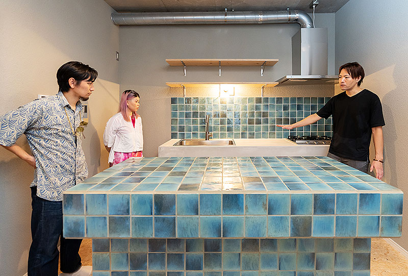 彫刻アーティスト山﨑千里 染飾アーティスト皆川百合、第一住建の3者が手がけたクレベール菊名104号室は、いったんゼロベースレベルのスケルトンからフルリノベーションし、タイルや床、天井、壁、照明など、こだわって仕上げた“アートな居住空間”。