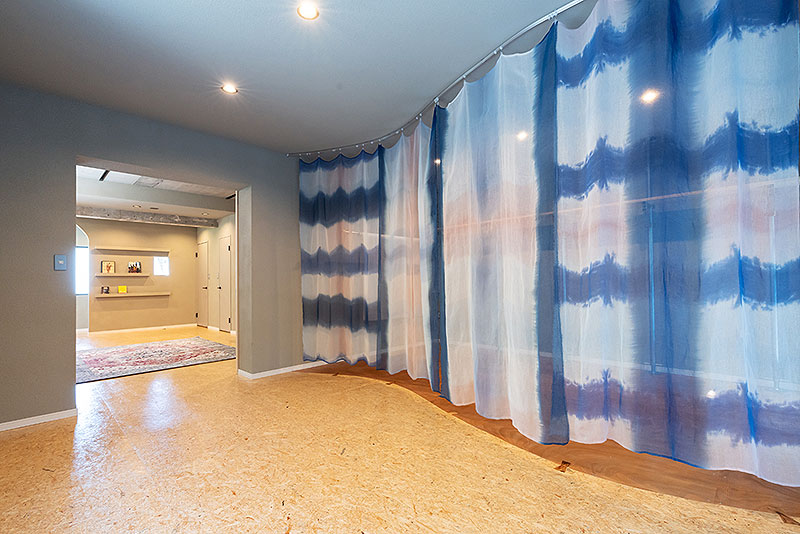 「洋室ではあえて2種類の床仕様とし、床の切り替え部分に沿って奈良のかやの生地を使ったレースカーテンで個性的な空間を演出。