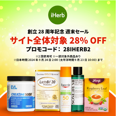 米国カリフォルニア発の自然派通販サイト iHerb(アイハーブ)は、ことしで創業28周年ということで、10月3日まで、日替わりで対象商品が28%OFFの「iHerb創業28周年セール」を開催中。