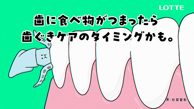 まさに“歯づまり界”のスター候補「いか」は、遠い海からやってきた、変幻自在のナイスガイ。軟体動物の矜持にかけて脱出を試みるも、歯が立たない(うまいっ)。