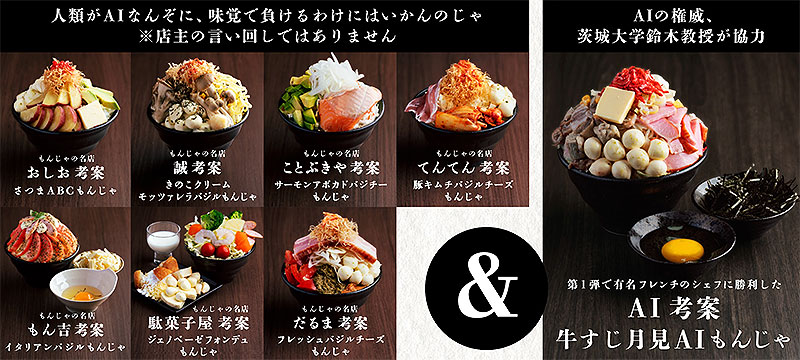 鈴木教授は、「もんじゃの素材の組み合わせは、2の100乗にもなる。これを人の作業でやると果てしないけど、オープンAI ChatGPT で導き出されたメニューに、“ひとひねり”いれて、今回の「牛すじ月見AIもんじゃ」を導き出した」という。