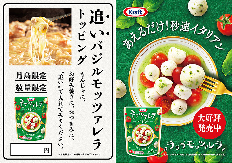 しかも、森永乳業「クラフト バジルフレッシュモッツァレラ」を使ったアレンジレシピが、いろいろ登場して、AIがつくったレシピが旨いか、月島もんじゃの老舗が考案した新作もんじゃが美味しいか、「月島 対 AI」の“絶品うまうま対決”だ!