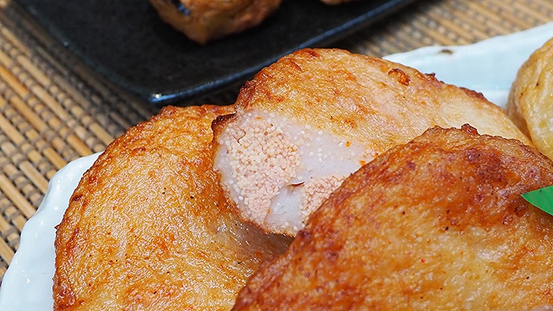 きめ細かで弾力のある食感のさつま揚げに明太子のプチプチ感のマリアージュ。香り豊かな風味もクセになる味わいで、少し塩気が強いため酒のつまみやご飯のおかずにもぴったりの一品だ。お値段は350円。