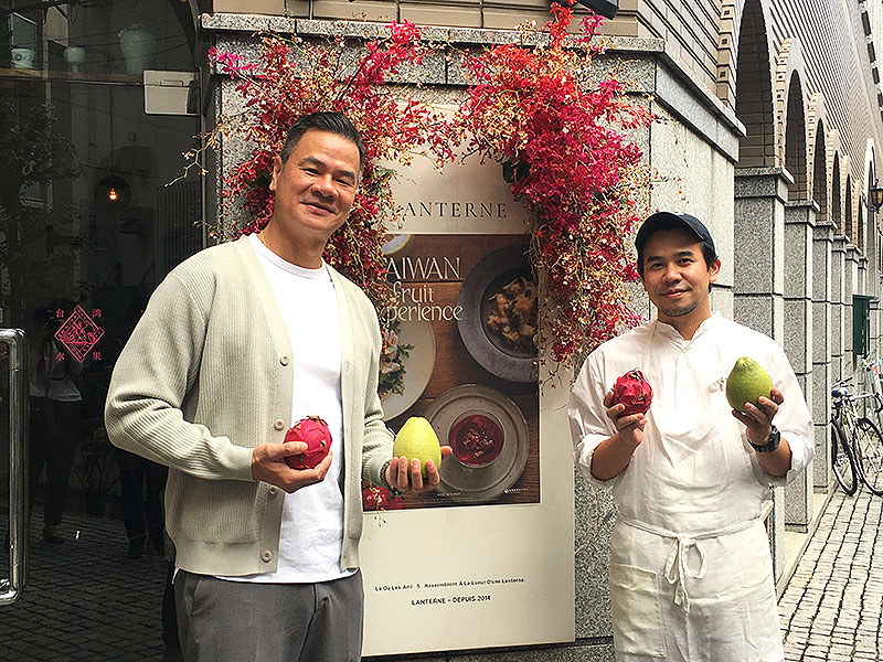丸山シェフと台湾貿易センター鄧之誠(とうしせい)東京事務所所長が、台湾産 旬のフルーツの特徴とアレンジについて、いろいろ教えてくれた。