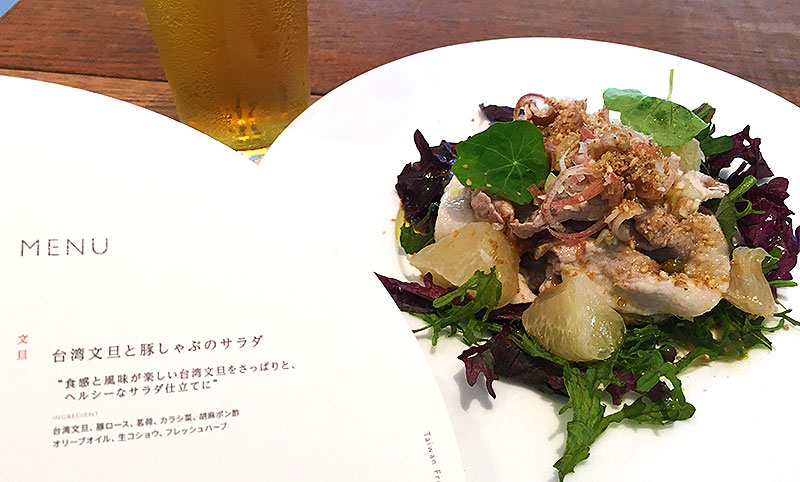 台湾産 文旦(ぶんたん)を使った「台湾文旦と豚しゃぶのサラダ」は、食感と風味が楽しい台湾文旦をさっぱりヘルシーなサラダ仕立てに仕上げたひと品。