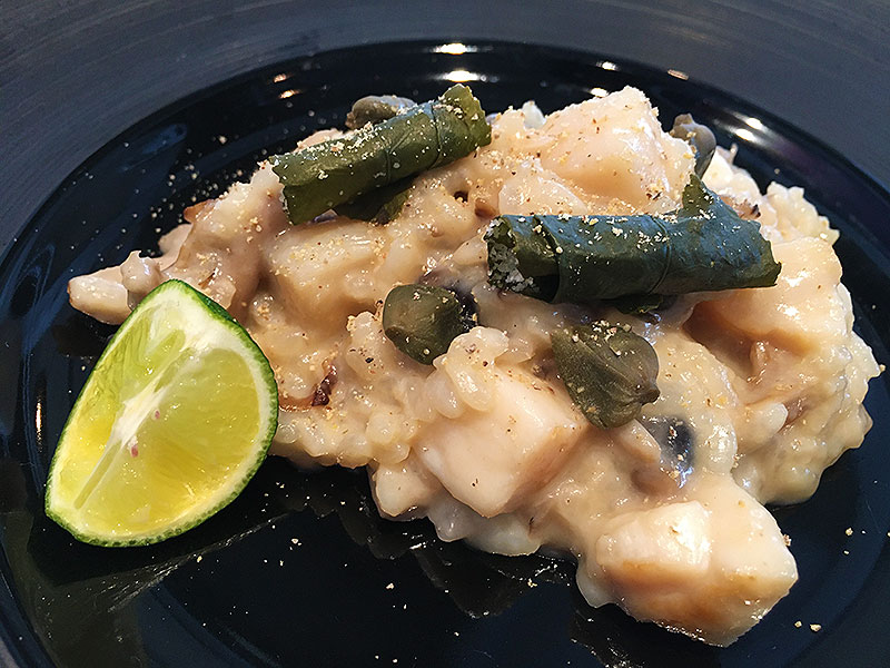 台湾産 阿里山烏龍茶を使った「阿里山烏龍茶とホタテ、きのこのリゾット」は、お茶の旨味と苦味を生かした茶粥からインスピレーションしたリゾット。