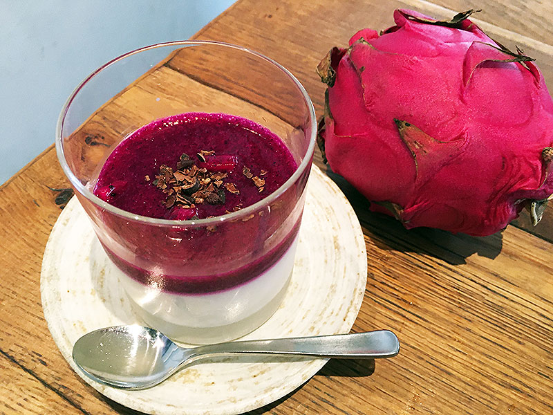 甘酒のパンナコッタ ドラゴンフルーツとカカオニブ