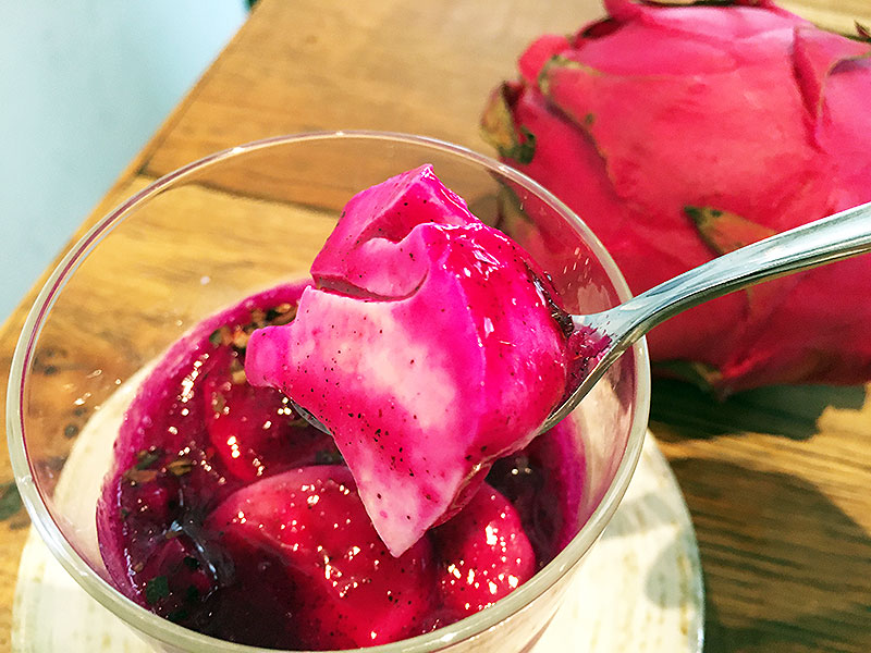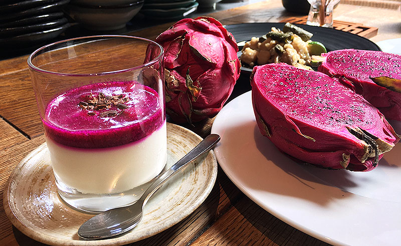 台湾産ドラゴンフルーツを使った「甘酒のパンナコッタ ドラゴンフルーツとカカオニブ」は、MEGUMI が「和の要素を」というリクエストに応え、甘酒をベースにつくった優しい甘さのパンナコッタに、台湾産ドラゴンフルーツでつくった色鮮やかなソースがのるひと品。