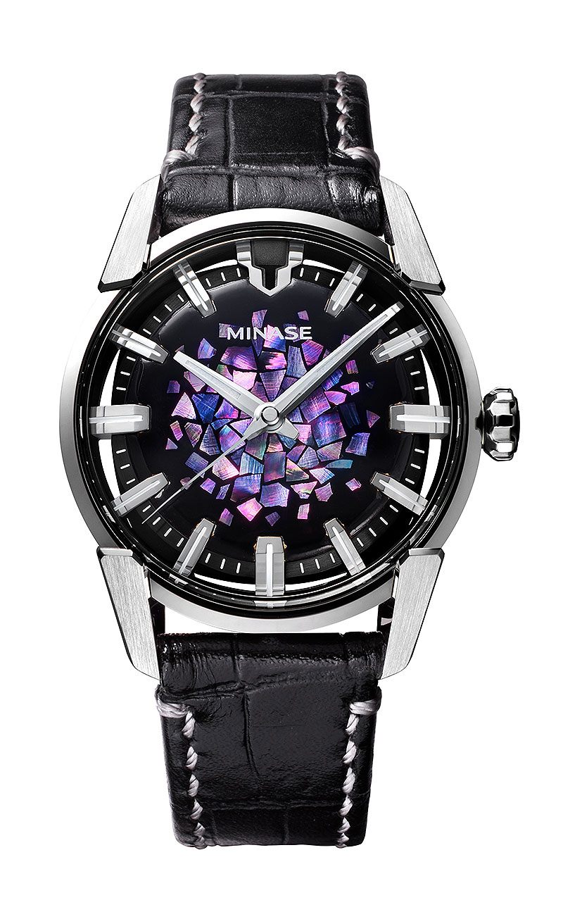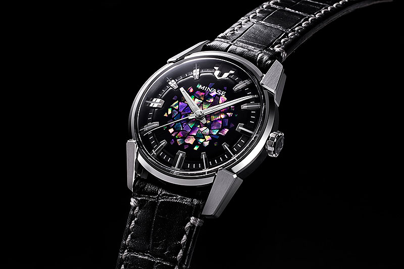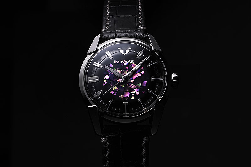 ハンドメイドジャパンを追求する MINASE(ミナセ)と、その原点である地元秋田の伝統工芸品 川連漆器 とのコラボレーションモデル――― DIVIDO漆シリーズ「虹の雲」は、川連漆器の名工「漆工房 攝津」が、天然の貝を用いて螺鈿(らでん)に仕上げた川連螺鈿の文字盤を制作。