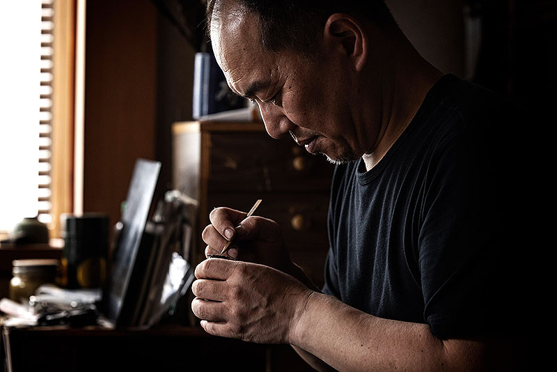 「漆工房 攝津」攝津広紀は、川連伝統の「塗り」「蒔絵」のほか、螺鈿、琥珀、銀地などの表現技法が高く評価される名工。