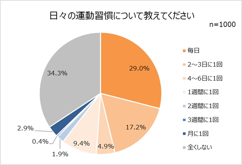 日々どのくらい運動をしているのか聞くと、6割以上の人が日ごろから運動をしている一方で、「全くしない(34.3%)」と回答した約3人に1人は運動を全くしていないことが明らかとなった。