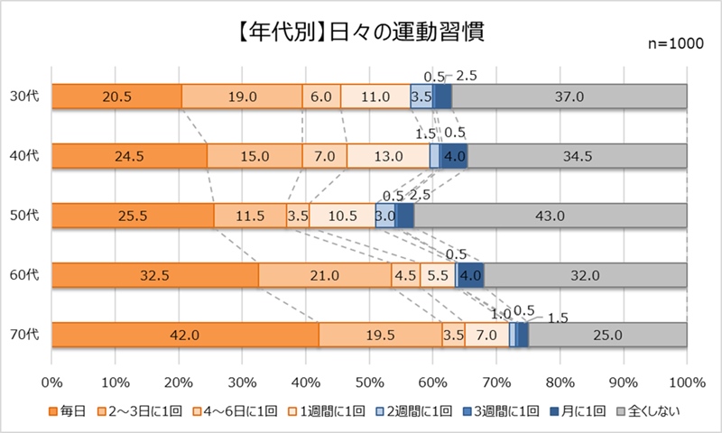 年代別で比較すると、日ごろから運動している人は70代が7割以上と一番多い結果に。「毎日(29.0%)」運動している人は全体の約3割で、年代別で比較すると、70代が一番多く約4割の人が回答。これは30代の約2倍だ。意外にも年代が上がるにつれて、毎日運動する人の割合も増えていることが見て取れる。