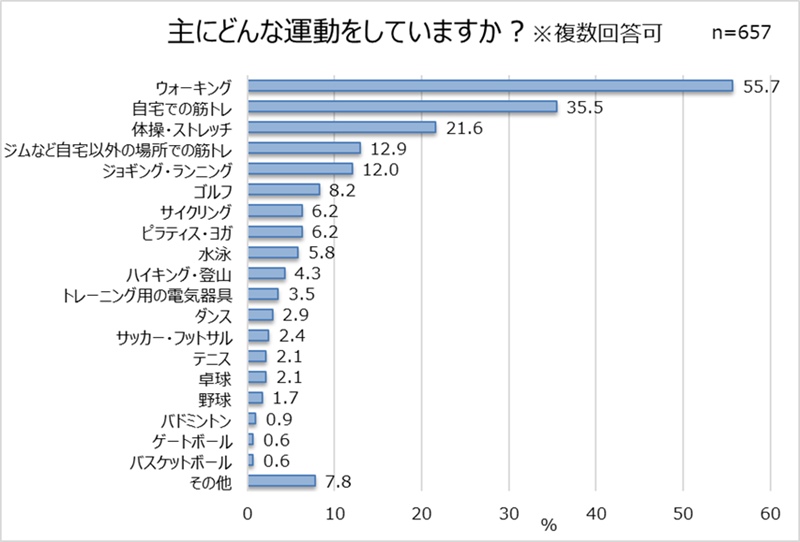 実際に、どんな運動をしているのかを具体的に聞くと、1位は「ウォーキング(55.7%)」と半数以上の人が回答。2位には「自宅での筋トレ(35.5%)」、3位には「体操・ストレッチ(21.6%)」がランクインした。道具などをあまり用意する必要がなく手軽に始められる運動をしている人が多いようだ。