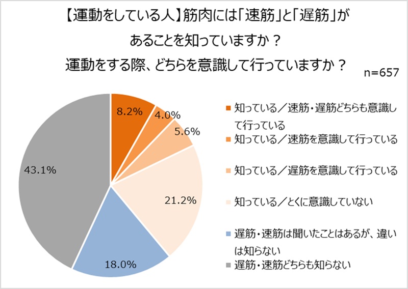 本調査では、日々運動をしている人の割合や頻度、取り入れている運動、運動をする理由など運動習慣の実態を調査。そのほか有酸素運動・無酸素運動への意識や、速筋・遅筋の認知度、運動以外に食事を意識しているかが明らかとなっている。