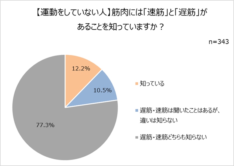 有酸素運動では遅筋、筋トレといった瞬発的な力は速筋が使われているが、この認知度を調査すると、普段から運動している人は約4割、運動していない人は約1割しか認知していないこが明らかとなった。速筋・遅筋という言葉自体、まだまだ浸透していないようだが、高齢になるにつれて速筋が衰えると、転倒などのリスクに繋がる可能性がある。しかし、それらを意識して運動を行っていると回答したのはわずか17.8%だった。運動はしているものの、鍛えないとリスクに繋がる可能性がある速筋を意識できていない人が多いようだ。