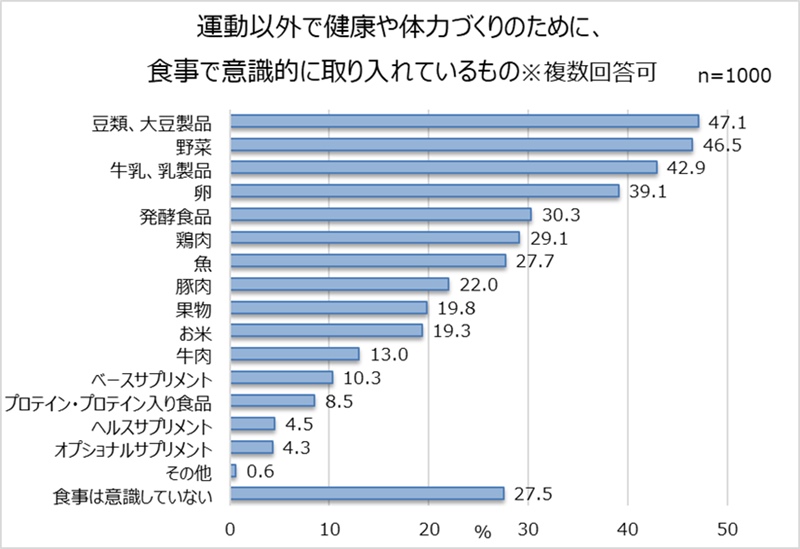 運動以外で健康や体力づくりのために食事で意識的に取り入れているものについて調査すると7割以上の人は、食事を意識していることが明らかとなった。具体的には「豆類、大豆食品(47.1%)」、「野菜(46.5%)」、「牛乳、乳製品(42.9%)」を取り入れている人が多いことが分かったほか、「卵(39.1%)」、「発酵食品(30.3%)」も上位に入り、たんぱく質を意識していることが考えられる。