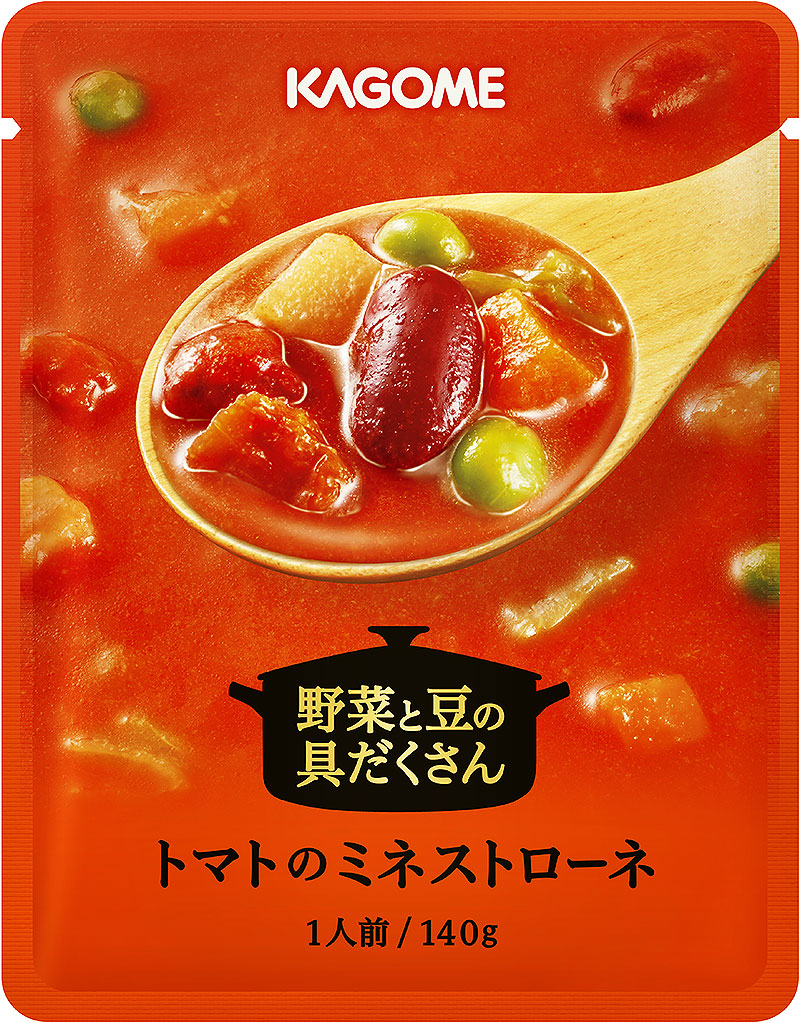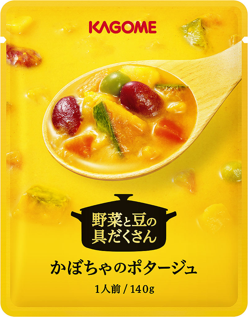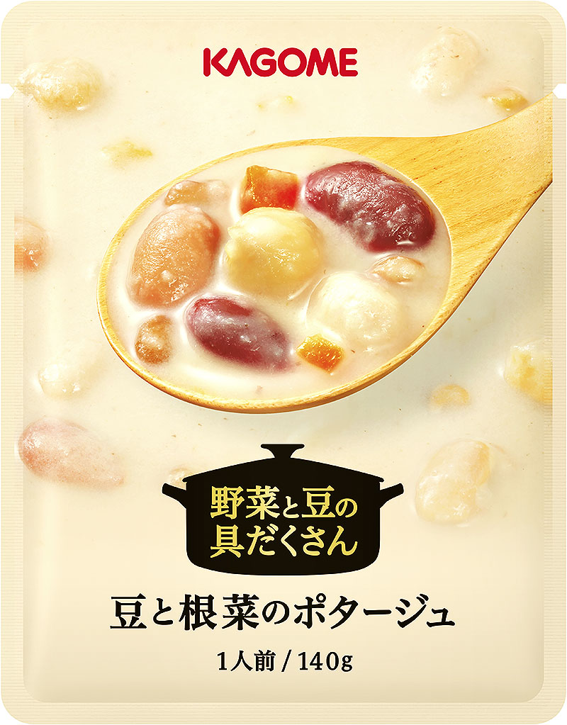 カゴメ健康直送便「野菜と豆の具だくさんポタージュ」は、野菜や豆をふんだんに使用した、お腹も心も大満足の食べごたえが人気の具だくさんポタージュ。