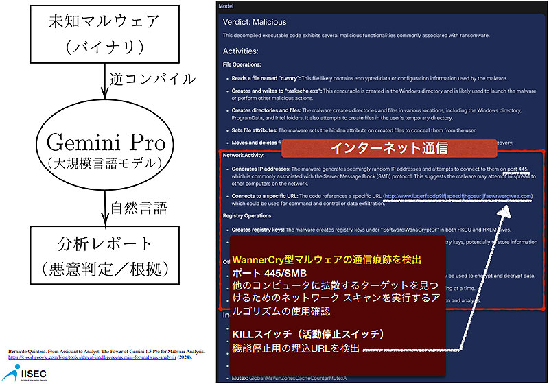 「未知マルウェアの逆コンパイルコードには、無意味な変数名や関数名が付与されるが、Gemini Pro は特徴的な値やプログラム構造をもとに、未知マルウェア(バイナリ)の特徴を根拠(推定の根拠にしたプログラム部分)を添えて推定できる」(大塚教授)