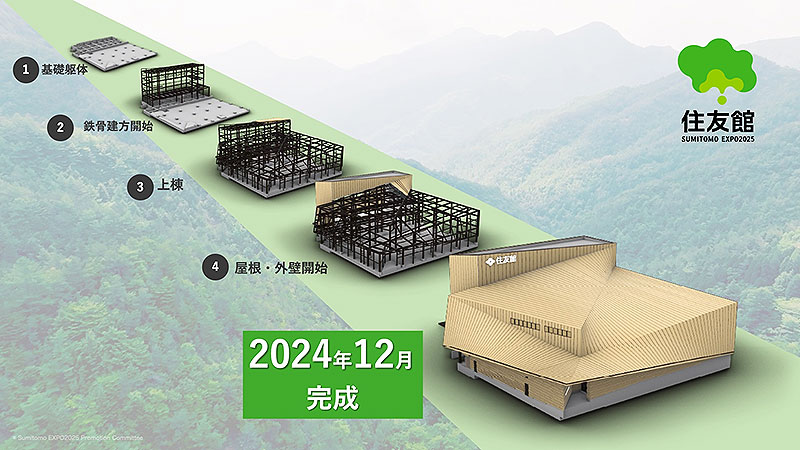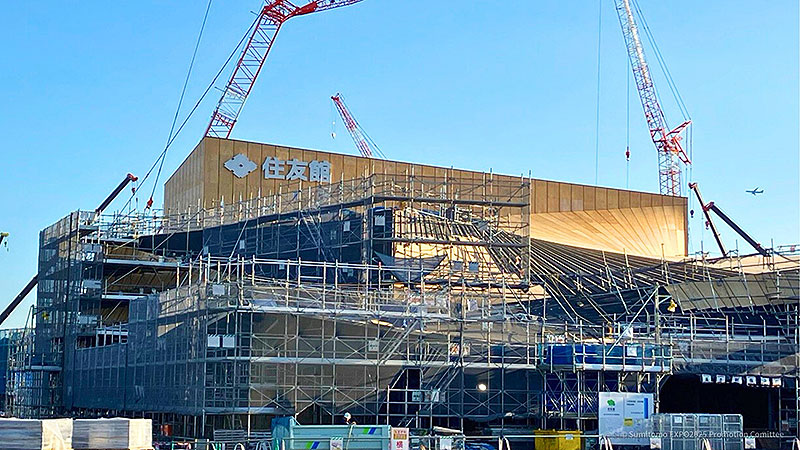 ちなみに「住友館」建設中の外観と屋根がこれ。12月下旬に建物が完成予定、2025 年の竣工に向け、展示・内装工事が進行中だ。