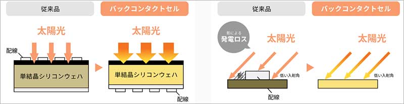 バックコンタクトセルは、受光面に配線がなくなることで配線の影による発電ロスがなくなり、太陽の入射角が低い朝や夕方、曇天時などの低照度環境においても安定した発電性能を維持。