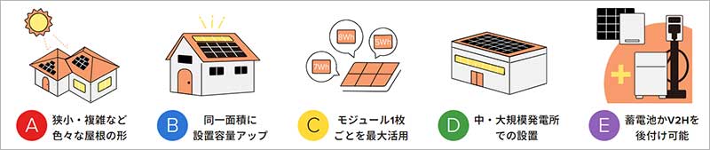 ハンファジャパン「Re.RISE-G3」シリーズは、太陽電池モジュール二種を組み合わせて、屋根面への効果的な配置を可能とし、限られたスペースでも設置容量の増加によってシステム全体の発電量が向上。
