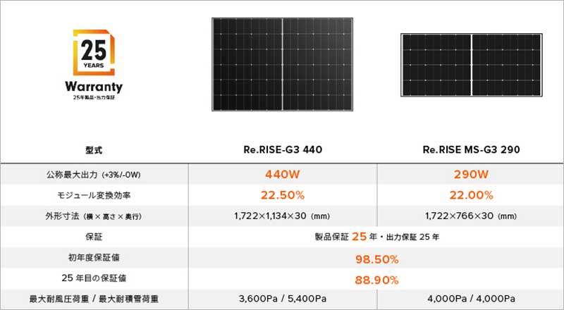 この裏付けにより「Re.RISE-G3」シリーズは、製品保証25年、出力保証25年の長期保証を実現した。