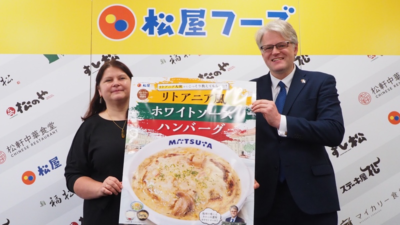 松屋フーズは2024年10月22日(火)10時から「リトアニア風ホワイトソースハンバーグ」を販売する。これに先立ち、都内で駐日リトアニア大使オーレリウス・ジーカスさん夫妻を招いた試食会が行われ、商品開発の経緯などが語られた。