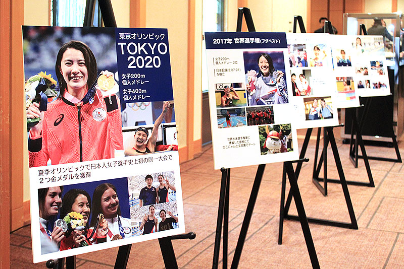 大橋悠依の才能を開花させ、師でもある東洋大学 水泳部 平井伯昌 監督(法学部 教授)もステージに登壇し、花束を受け取ると、辛いトレーニング時代をいっしょに振り返り、笑った。
