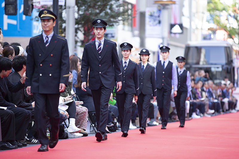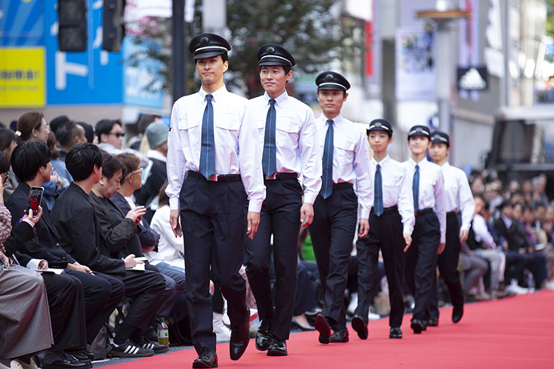 そして SHIBUYA RUNWAY『THE INCUBATION』では、次世代のファションをつくる服飾専門学校生が、16年ぶりの制服リニューアルを控え、まもなく着用を終える制服(画像:ジャケットなし列)の資源循環に取り組む東急電鉄株とコラボレーション。