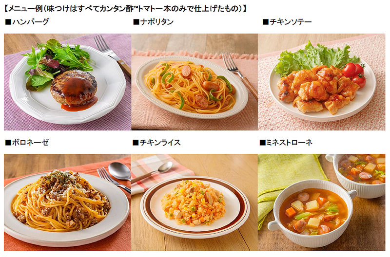 ミツカン「カンタン酢トマト」のラベルデザインは、ハンバーグ・チキンソテー・ナポリタンの3種類。