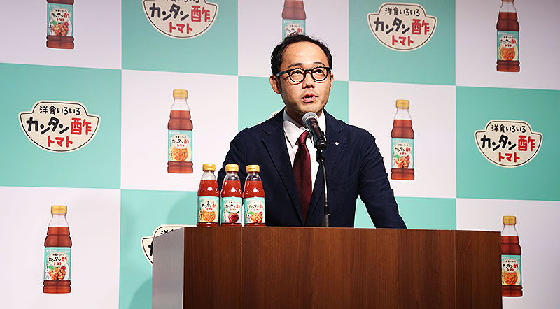 「ミツカン『カンタン酢トマト』は、カンタン酢ブランドの美味しさ(甘酸っぱい美味しさ)にトマトや鶏だしなどの美味しさが加わったカンタン酢トマトであれば、洋食メニューの味つけがこれ一本でカンタンに決まり、手作りできる楽しさと手軽にお酢が摂れる充実感を届けられると思い、開発しました。