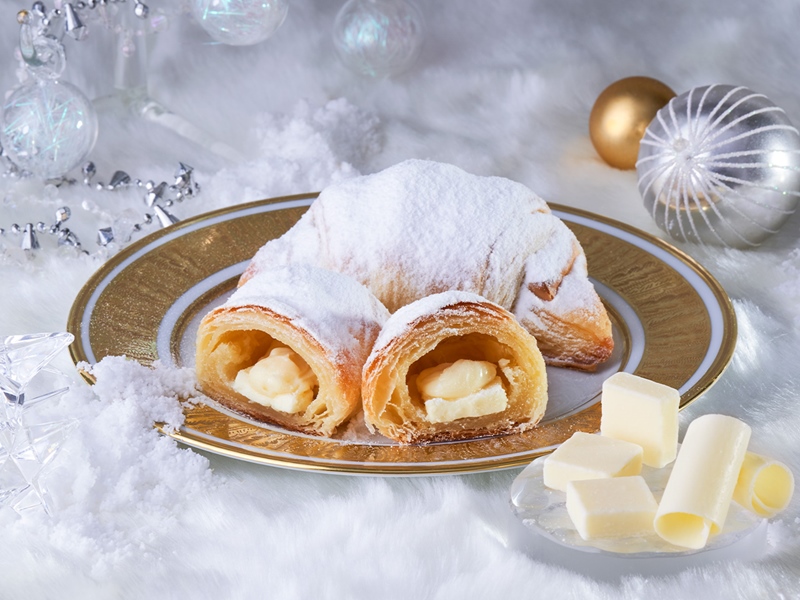 発酵バターとホワイトチョコペーストを練り込んだチョコクロ生地に、ホワイトチョコレートとミルククリームを包み込んで焼き上げ、表面には降り積もる雪のようにたっぷりと粉糖をかけた。