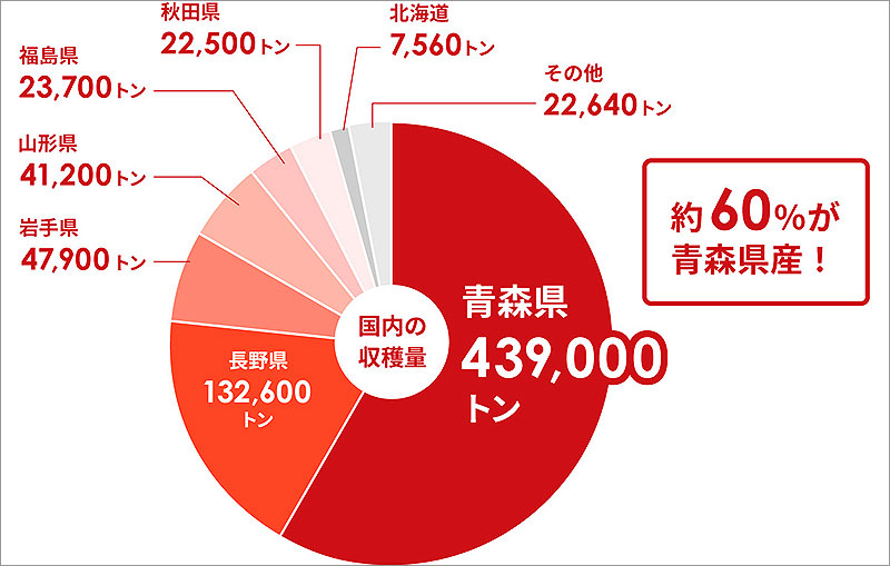 円グラフのとおり、ニッポンの りんご は、全国のりんご生産量の約60%を占める生産地が、青森県。