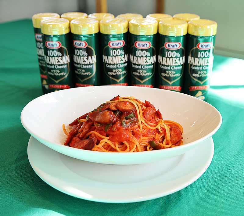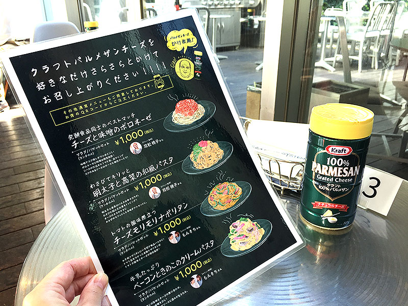 フードメニュ―には「クラフト100%パルメザンチーズ」のボトルがセットで提供され、心ゆくまで「クラフト100%パルメザンチーズ」を振りかけて!