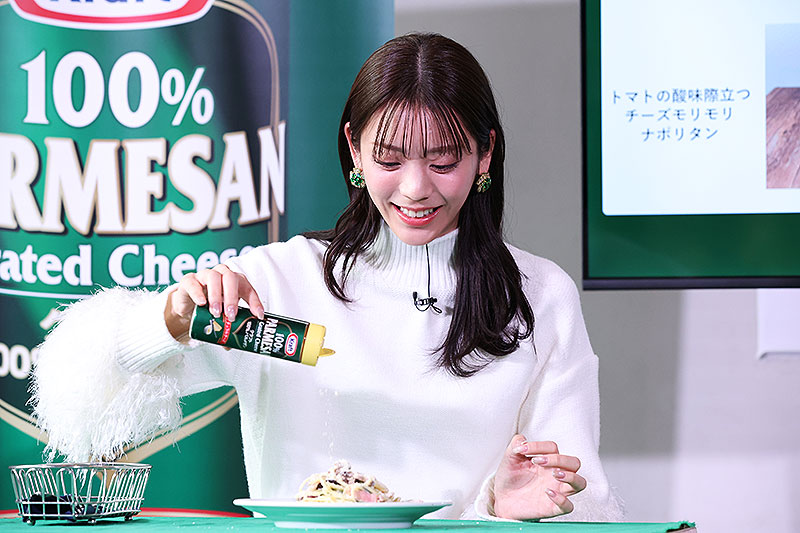 「商品カラーをイメージした緑のスカートと、粉チーズということで、粉雪舞うパスタ店をイメージした真っ白なニットにしました。これは……贅沢感ありますね、こんなにチーズかけられて、心も満足感ありますね」(貴島明日香)