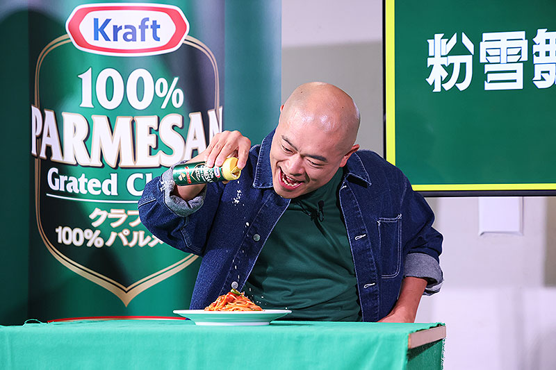 「チーズおじさん」はこの日のためにイタリアから初来日して、森永乳業「クラフト 100%パルメザンチーズ」を思いっきり「ネネネネネネベェ~♪♪♪」(ゆ、ゆ、ゆ、雪~~~~~~)。