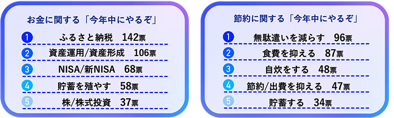 「お金に関する「今年中にやりたいこと」1位は、「ふるさと納税」。続いて、2位に「資産運用/資産形成/投資」、3位「NISA/新NISA」が選ばれました。