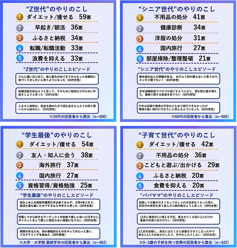 2024年「やり切りたいこと」を、各年代やライフステージごとにランキング分析すると、それぞれにおいての意識の違いが浮き彫りに。