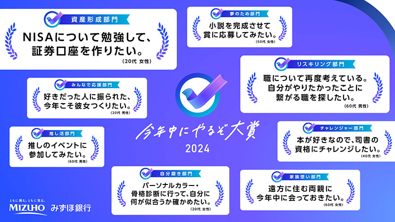 みずほ銀行は、​一人ひとりのやりたい気持ちに再び火をつけるべく、全国約2万人に「年内のやりのこし」を調査し、「今年中にやるぞ大賞 2024」を発表。