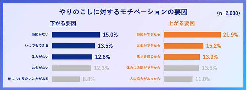 やりのこし解消に向けたモチベーションの要因について聞いてみると、「時間」が主な原因であることが明らかに。