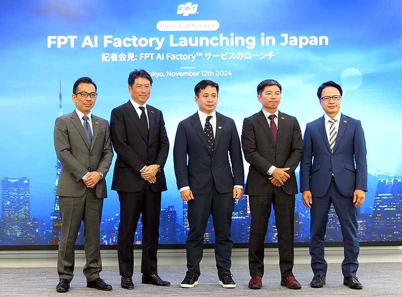「FPT AI Factory」発表会には、FPTジャパンホールディングス ド・ヴァン・カック 代表取締役社長、FPTコンサルティングジャパン グエン・フウ・ロン CEO、FPTスマートクラウド レ・ホン・ヴィェト CEO、SCSK 小峰正樹 プロダクト・サービス事業グループ長らが登壇し説明した。