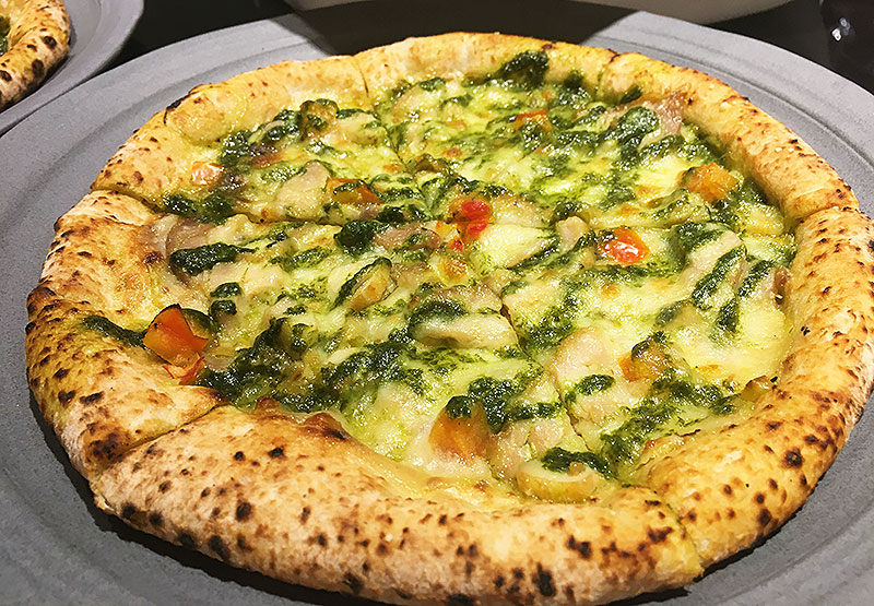 金のジェノベーゼピッツァの生地は 1枚ずつていねいに手で伸ばすことでナポリピッツアの特長である歯切れのよい食感を実現。